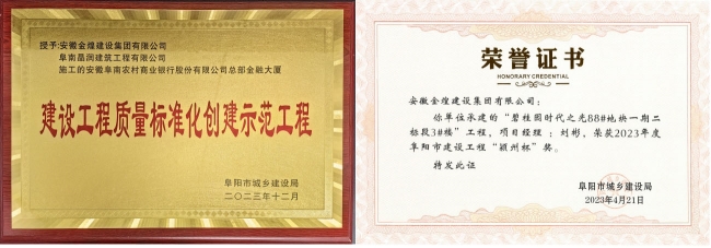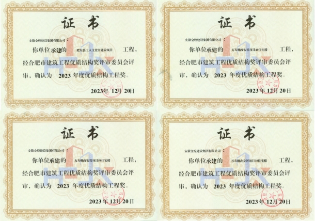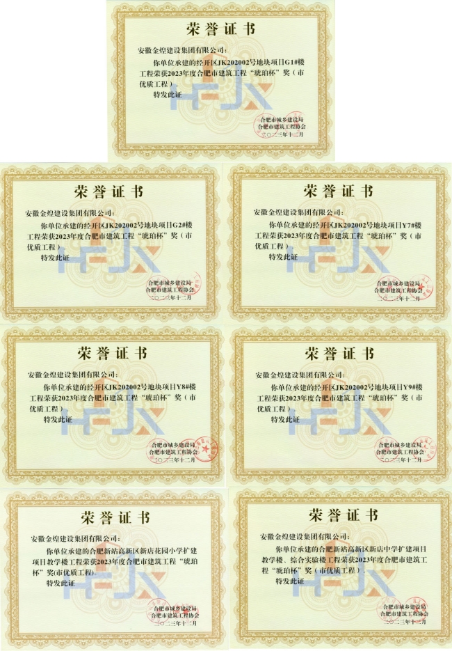 从各行业主管部门公告的工程质量类表彰获悉,金煌集团荣获7项合肥市优质工程“琥珀杯”奖,1项阜阳市优质工程“颍州杯”奖,1项阜阳市建设工程质量标准化创建示范工程,12个单体工程荣获合肥市优质结构奖。