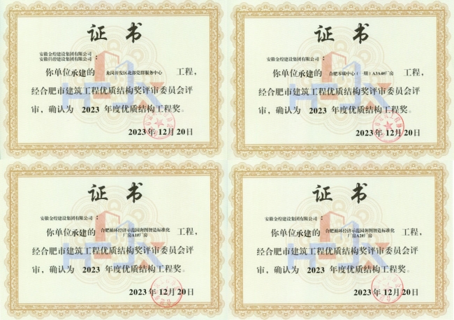 肥东县工人文化宫建设项目,龙岗开发区北部党群服务中心,合肥循环经济示范园奔图智造标准化厂房A1#、A2#厂房,万寿棚改安置项目4#、5#、7#、11#、14#、15#、18#住宅楼,合肥零碳中心(一期)A3A4#厂房荣获合肥市建筑工程优质结构奖。