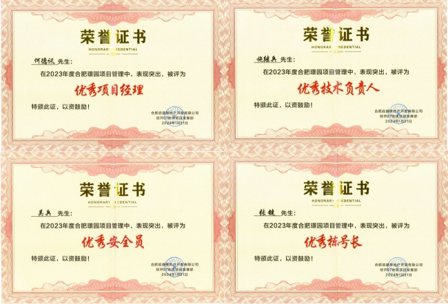 近日,安徽金煌建设集团收到中海房产旗下合肥启盛地产开发有限公司的表彰信及施工现场管理人员的荣誉证书。表彰信中对金煌集团承建的合肥璟园(JK202207地块)项目二期总承包工程,在第三方评估检查中取得合肥公司第二名,集团公司第九名的优异成绩表彰。同时,项目部施工管理人员何德迅等四位同志荣获建设单位鼓励表扬。