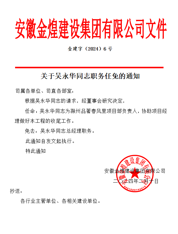 关于吴永华同志职务任免的通知