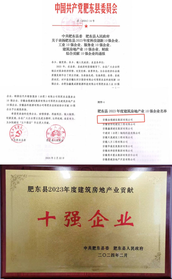 会中表彰了建筑房产10强企业、服务业10强企业、科技创新10强企业、工业10强企业、财政综合贡献10强企业。安徽金煌建设集团入围建筑房产10强企业称号并位居首位。