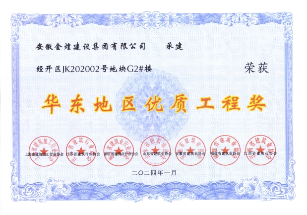 近日,从安徽省建筑业协会公布的2023年度“华东地区优质工程奖”文件中获悉,由安徽金煌建设集团承建的经开区JK202002号地块G1#楼、G2#楼两项工程荣获“华东地区优质工程奖”的荣誉。