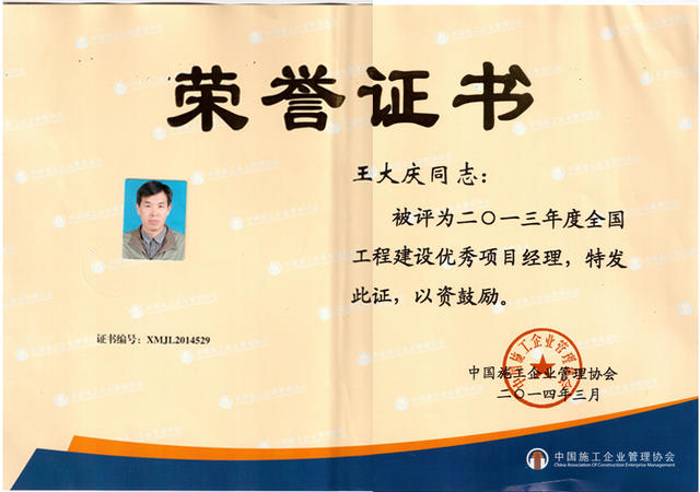 王大庆2013全国优秀项目经理