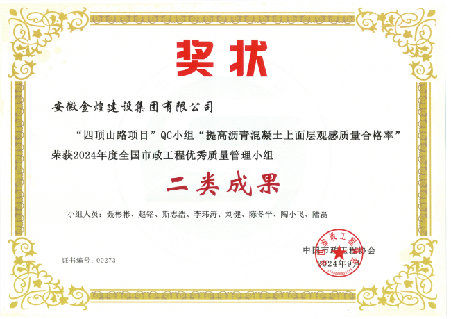 全国市政QC小组工程优秀质量管理小组二类成果奖