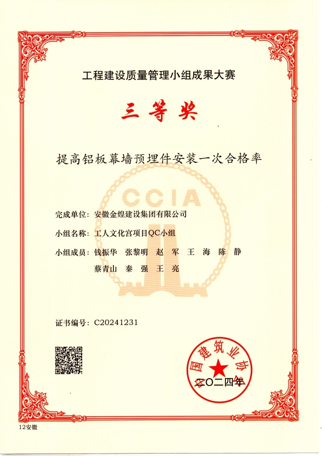中国建筑业协会工程建设质量管理QC小组成果大赛三等奖