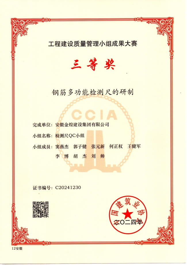 中国建筑业协会工程建设质量管理QC小组成果大赛三等奖